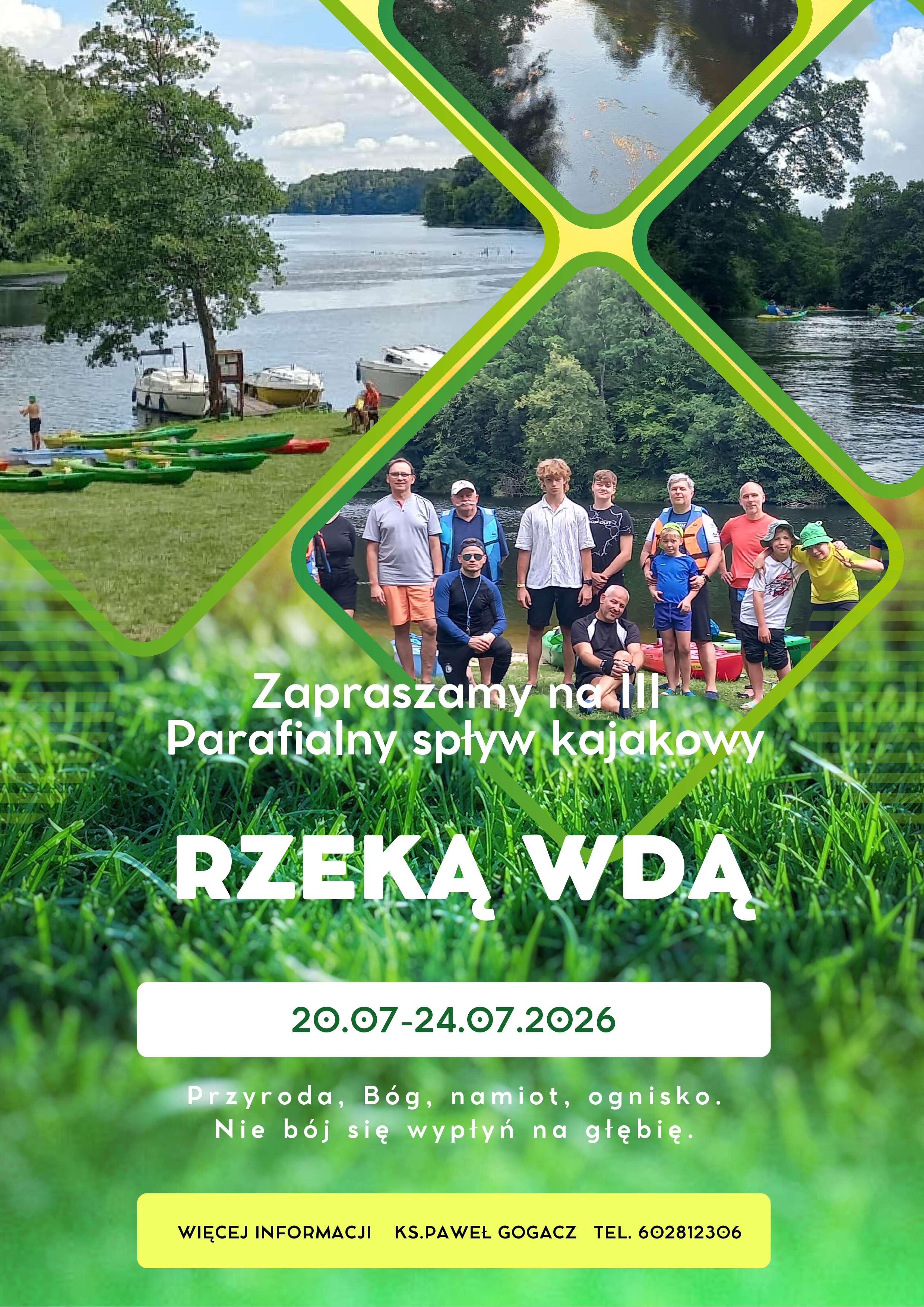 - Nasza parafia już po raz trzeci organizuje kilkudniowy spływ kajakowy w okresie wakacji. W dniach od 20 – do 24 lipca zapraszamy na rzekę Wdę (Bory Tucholskie). Zapraszamy osoby, które lubią pływać na kajakach a także, te które jeszcze nie spotkały się z taką formą wypoczynku. Będziemy pokonywali do 20 km dziennie. Wspólne przygotowywanie posiłków, ogniska, modlitwa, noclegi pod namiotami dają możliwość aby odpocząć na łonie natury, wspólnie się poznać i jeszcze bardziej zintegrować. Więcej informacji na plakacie w gablocie, na stronie parafialnej, Facebooku. Zapisy u ks. Proboszcza.