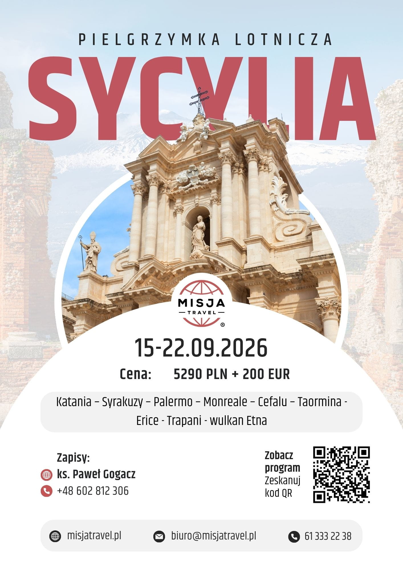 - Cieszy nas duże zainteresowanie pielgrzymką na Sycylię „Śladami sycylijskich i włoskich świętych”, w dniach od 15 do 22 września 2026 roku. Po jednej niedzieli mamy komplet pielgrzymów a także listę rezerwową. Bardzo prosimy osoby, które zapisywały się z tzw. „znakiem zapytania” o potwierdzenie uczestnictwa w pielgrzymce. Biuro podróży organizujące wyjazd podjęło też starania o możliwość zwiększenia liczby pielgrzymów. W najbliższym tygodniu będziemy dokładnie wiedzieli ile osób może wyjechać na pielgrzymkę.