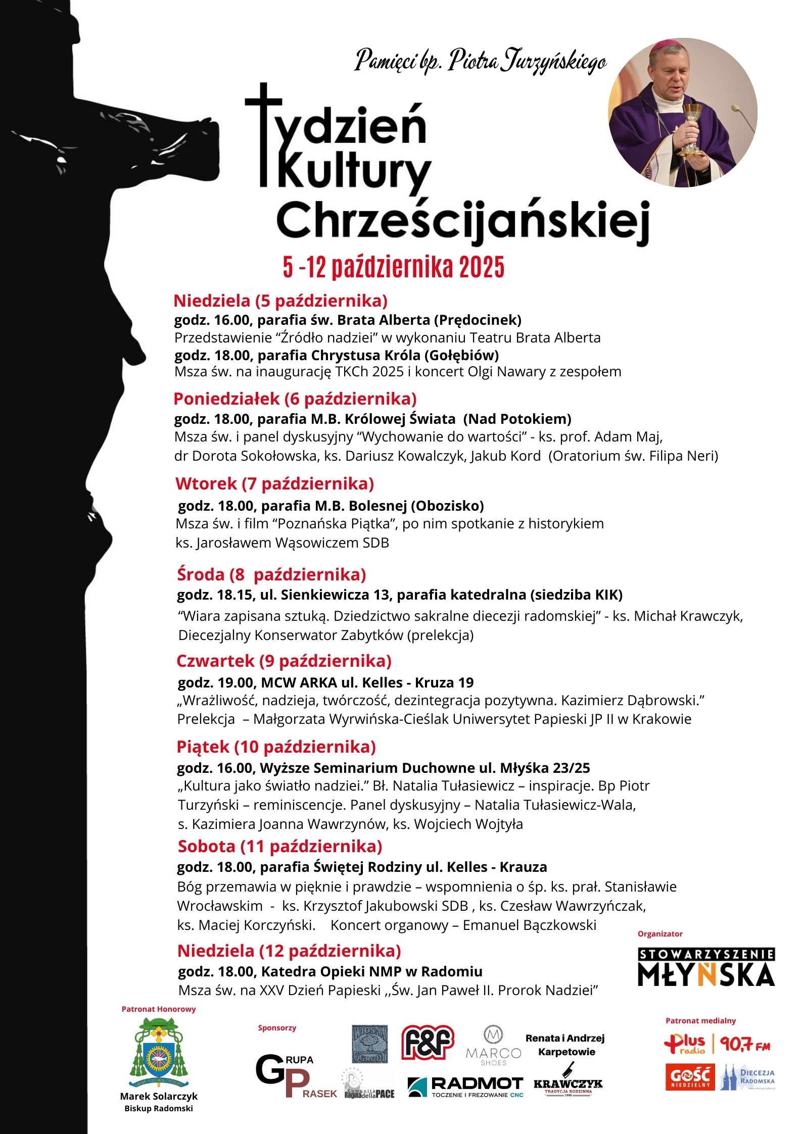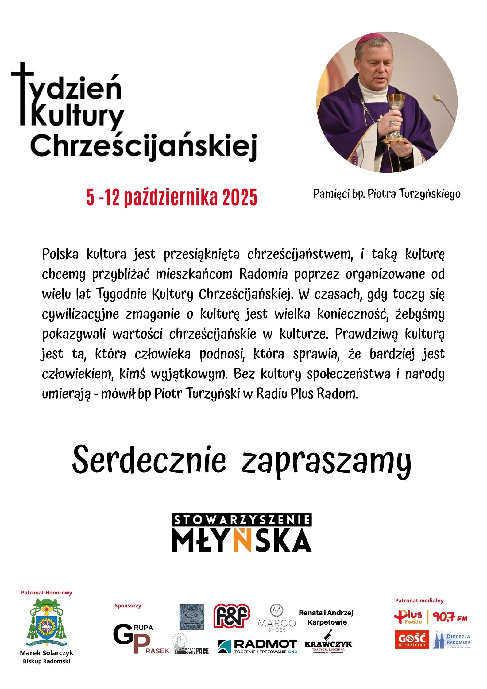 - Od dzisiaj rozpoczął się w naszym mieście Tydzień Kultury Chrześcijańskiej, organizowany przez Stowarzyszenie „Młyńska”. Program Tygodnia Kultury Chrześcijańskiej możemy zobaczy na naszej stronie internetowej, Facebooku i w gablocie przed kościołem. Warto zwrócić uwagę na wiele ciekawych inicjatyw.