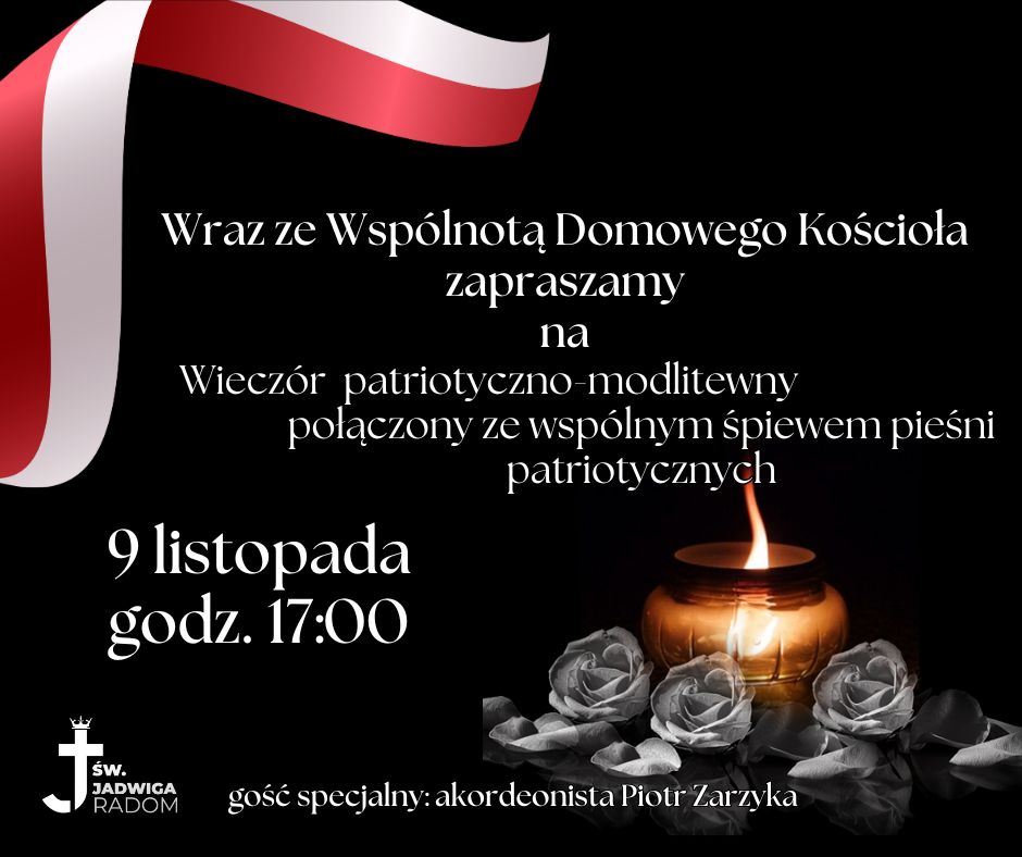 - W wtorek 11 listopada przypada 107 rocznica odzyskania niepodległości przez naszą Ojczyznę. Z tej okazji już w najbliższą niedzielę 9 listopada, na godz. 17.00 zapraszamy do naszej świątyni na wieczór patriotyczno – modlitewny połączony ze wspólnym śpiewaniem pieśni patriotycznych. Spotkanie jest przygotowane przez Ruch Domowego Kościoła a weźmie w nim udział ceniony akordeonista, uczestnik i laureat ponad 70 konkursów i festiwali muzycznych o randze międzynarodowej, ogólnopolskiej oraz regionalnej, nasz parafianin, Pan Piotr Zarzyka. Zachęcamy do wspólnego spędzenia niedzielnego popołudnia, modlitwy za naszą Ojczyznę a także do wywieszenia flagi narodowej.